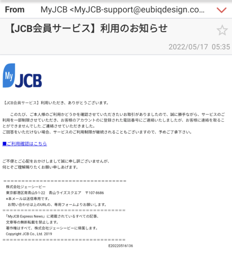結論から言うと、このメールは「JCBを名乗った詐欺メール」ですので、リンク先をクリックしないようにしてください。
